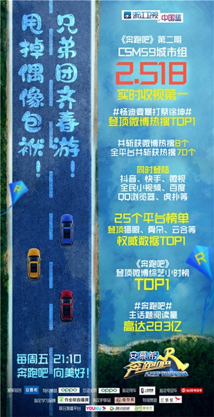 第二期节目收视率CSM59城2.518%,同时斩获当晚播出实时收视率冠军,话题热度方面共斩获微博热搜8个,其中#杨迪要暴打蔡徐坤#登陆微博热搜第一位。此外,第二期节目在全平台共获得近70个热搜词,同时登陆抖音、快手、微视、全民小视频、百度、QQ浏览器、虎扑等25个平台榜单,登顶猫眼、骨朵、云合等权威数据TOP1,#奔跑吧#主话题阅读量超过283亿。作为国民综艺,一如既往地为观众们注入快乐能量。