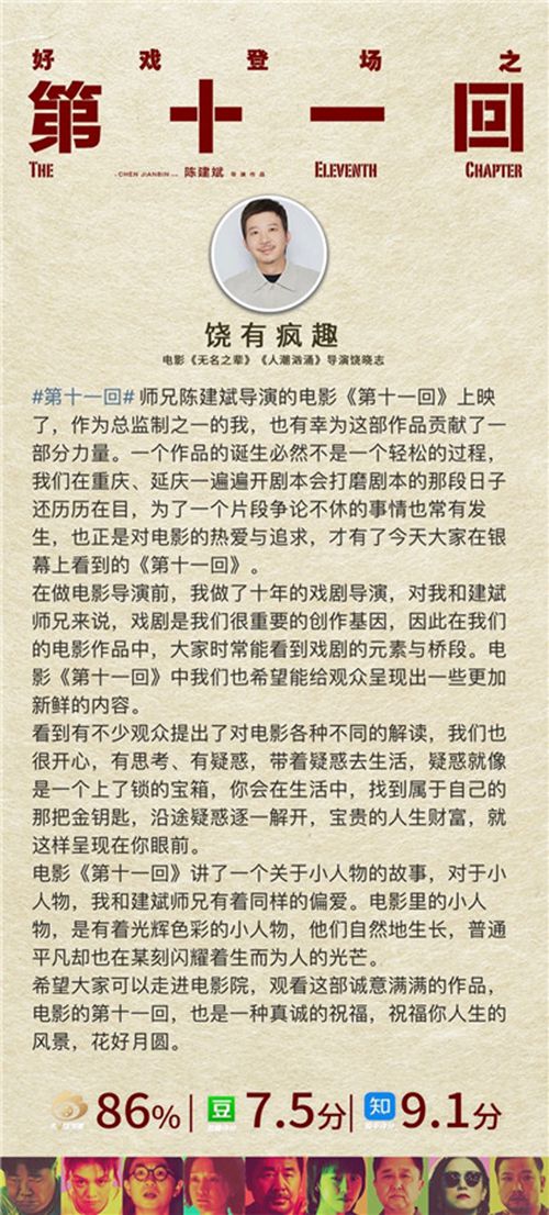 饶晓志发文分享了他在剧本打磨过程中的幕后故事“一个作品的诞生必然不是一个轻松的过程,我们在重庆、延庆一遍遍开剧本会打磨剧本的那段日子还历历在目,为了一个片段争论不休的事情也常有发生,也正是对电影的热爱与追求,才有了今天大家在银幕上看到的《第十一回》。”