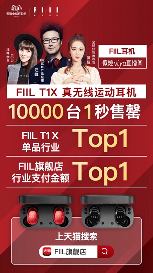 当天直播间里推荐的主要是这款FIIL T1 X真无线运动耳机,在双十一前夜这样一个品牌大联欢的时间点,FIIL开播仅一秒售罄10000台,当晚FIIL更是荣获单品行业与行业支付额双TOP 1!