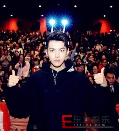 吴亦凡在一次活动中,和现场的粉丝们合照纪念。他身后的两盏灯十分抢镜。照片拍摄出来错位,两盏灯在吴亦凡的头上,很像他头上戴着两个发光的发箍,很是有趣。