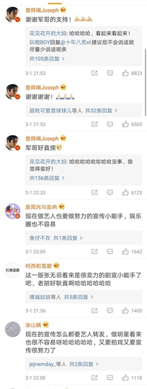 面对如此耿直的挂人式宣传,曾舜晞接连回复:“谢谢军哥的支持”“谢谢谢谢”,感谢支持不忘调侃一句:“军哥好直接”。这一番有趣互动让不少网友在胡军微博留言:“被这种蠢萌的互动可爱到了”、“这一版的张无忌看来是很卖力的剧宣小能手,老胡好耿直啊哈哈哈”、“曾舜晞的私信也太诚恳了吧!胡军又是什么直男的硬核宣传”。更有网友纷纷表示:被圈粉了,这就去看新《倚天》!