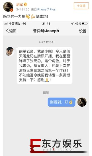 新版《倚天屠龙记》开播之际,曾舜晞发微博感悟能饰演张无忌是自己极大的福分与运气,致敬经典,他会拼命将作品拍好。这一番肺腑之言也获得了数十位曾经合作过的导演、艺人朋友们应援打call,印证了曾舜晞的圈中好人缘。然而,在一波应援之中,胡军的“挂人式力挺”可谓是硬核十足,直接将曾舜晞诚恳请求转发宣传的私信截图发了出来。曾舜晞在私信中诚恳提到:“今天倚天屠龙记开播,我在里面饰演张无忌,这个角色,对于我来说,意义重大!不知能否今晚帮我转发一条微博支持一下,感谢”,胡军回复他:“刚看到,好”,引发网友爆笑:互动怎么有点萌。
