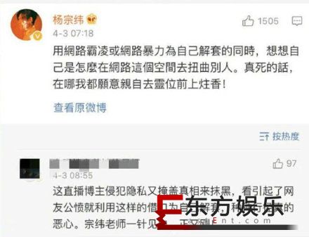 杨宗纬评论男主播,偷拍陈冠希并扬言自杀!4月1日,国内某平台主播在日本街头偶遇陈冠希和他的女儿。陈冠希婉拒了这名主播的合影要求后,被他的跟拍行为激怒,现场发飙怒怼这名主播,他对着正在收看直播的观众表示:“不要搞我跟我的小孩子了!”该主播因此遭受网络暴力,扬言要自杀!杨宗纬回复了爆料微博,评论:“用网络暴力为自己解套的同时,想想自己在网络是怎么扭曲别人的,真死的话,在哪儿我都愿意亲自去灵位上柱香!”