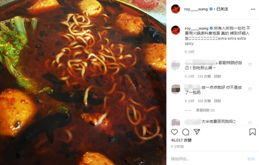 王源用火锅底料煮泡面,辣到怀疑人生!2月10日,王源在个人社交网站分享了自己用火锅底料煮泡面的故事:“所有人听我一句劝,不要用火锅底料煮泡面,真的,辣到怀疑人生,extra extra extra spicy。”