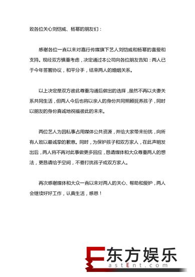 12月22日晚,杨幂刘恺威通过二人所属经纪公司嘉行传媒发布离婚声明。声明中称,两人已于今年签署协议,和平分手。离...