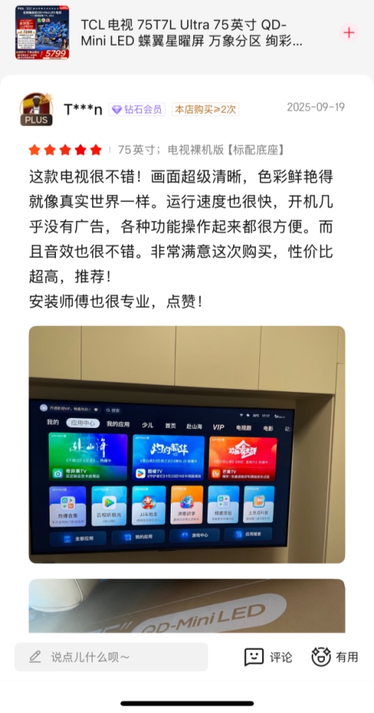 TCL T7L Ultra自开售以来,在京东、天猫等平台屡次售罄,成为消费者口中的“断货王”。这款全网卖爆的QD-Mini LED电视,彻底打破了“没万元预算不敢想高端画质”的魔咒,直接把高端配置拉到几千元价位,重新定义了质价比天花板。正如某电商平台的钻石会员所言:“这款电视很不错!画面超级清晰,色彩鲜艳得就像真实世界一样。运行速度也很快,开机几乎没有广告,各种功能操作起来都很方便。”这些真实声音印证了其技术实力与用户需求的高度契合。