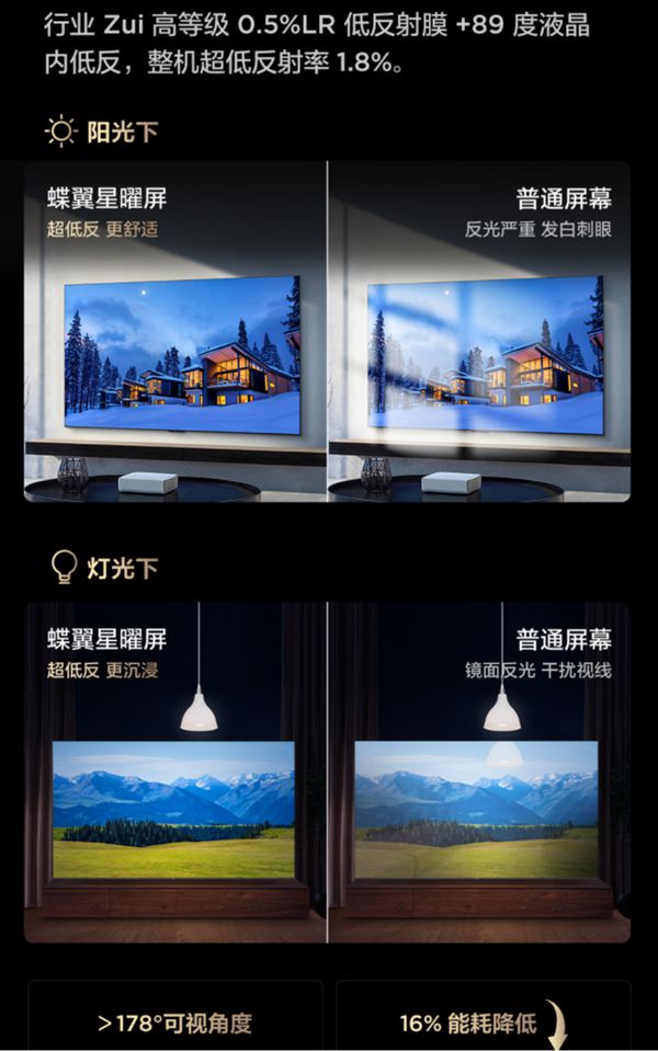 TCL T7L Ultra则完全不同,其搭载华星高阶HVA蝶翼星曜屏,采用了通常高端旗舰机型才会使用的“镜面低反”方案,通过在屏幕外层覆盖行业最高等级的0.5% LR低反膜,结合89度液晶内低反设计,形成内外双重抗反防护,将整机反射率降至惊人的1.8%。这一数据意味着即使在阳光直射的环境下看电视,画面也会始终保持通透清晰,屏幕上不会出现令人头疼的倒影或光斑。