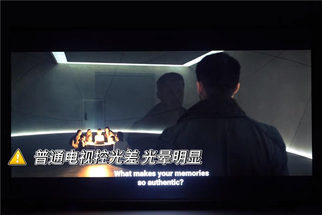 在我看来,这分区控光就是Mini LED技术的灵魂。但有分区甚至多分区可不等于就控得好光。普通Mini LED电视虽然也标注分区数量,但底层控光技术不够成熟,对于光线的控制不够精准,这容易导致光晕现象明显,尤其在字幕场景,明亮物体边缘泛白,清晰度下降。