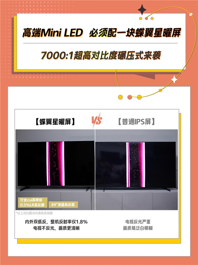 TCL T7L Ultra则走上了一条技术门槛更高的路。它全系搭载的蝶翼星曜屏,采用了旗舰级的镜面低反方案。屏幕表面覆盖了行业最高等级的0.5% LR低反膜,并配合89°的液晶内低反结构,将整机反射率压制至惊人的1.8%。这一数据,远低于市面上常见的AGLR屏所宣传的2.6%。这意味着,在光线复杂的客厅环境中,无论是白日的自然光,还是夜晚的室内照明,T7L Ultra都能近乎“无视”环境光的存在。